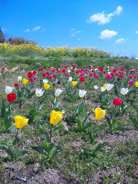 帰り道、チューリップ畑を発見。
